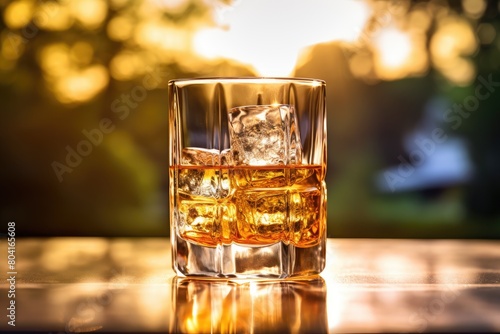 Golden Hour Bliss: Whiskey on the rocks in a golden-hued glass.