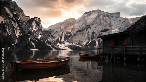 Golden Hour on Braies Lake with Boats and Dolomite Peaks – Photorealistic Landscape