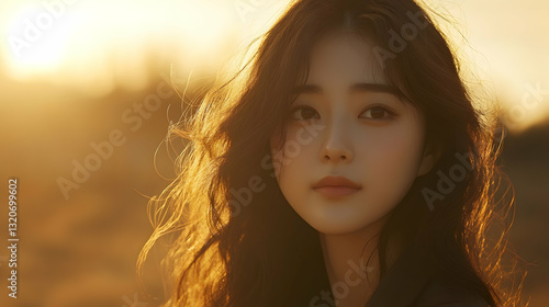 Golden hour portrait of a serene young asian woman with sunlit hair and gentle expression