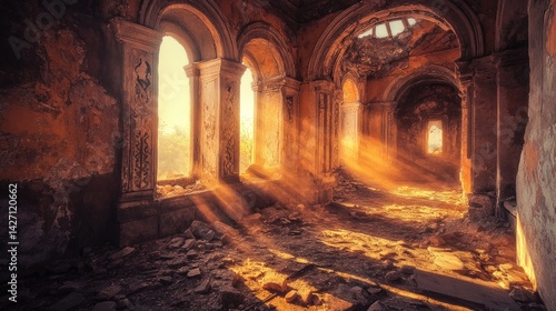 Golden Hour Ruins Sunbeams in Decayed Church.
