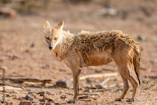 golden jackal or Canis aureus closeup or portrait in wild with eye contact at ranthambore national park forest rajasthan india asia