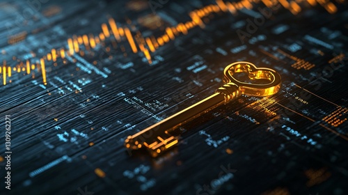 Golden key on dark wooden table symbolizing private credit and financial security, with abstract financial charts in the background, representing trust and wealth management concepts.