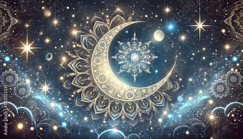 Golden Mandala with Crescent Moon and Stars over Night Sky