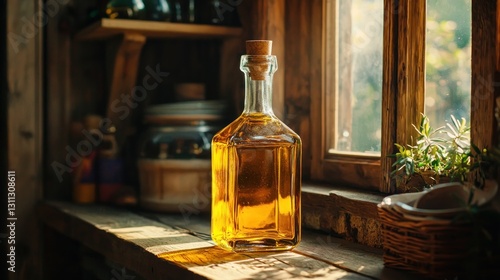 Golden oil in glass bottle on rustic window sill.
