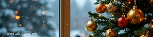 Golden ornaments on a Christmas tree against a snowy window, decorations, snow