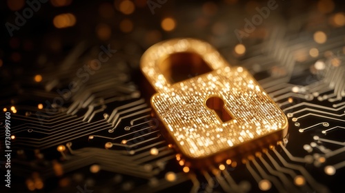 Golden padlock on digital circuit background representing security and protection in technology and data management with glowing lights and sparks
