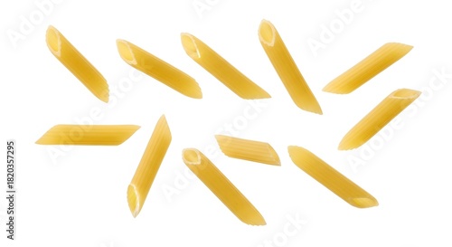 Golden Penne Pasta Arrangement: Close-Up Food Photography on White Background for Culinary Concepts and Recipe Illustrations.