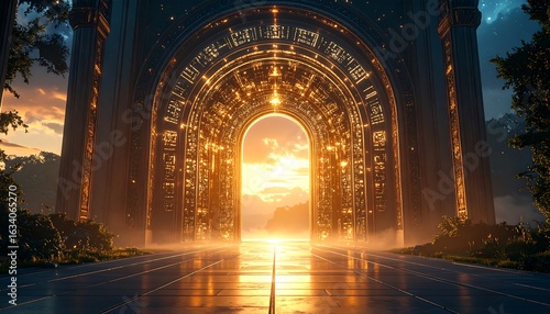 Golden Portal Opening to Bright Sunset in Fantasy Landscape