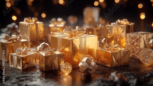Golden presents are displayed with bokeh background and sparkling ornaments. Great for holiday season posts, ads or any festive celebration.