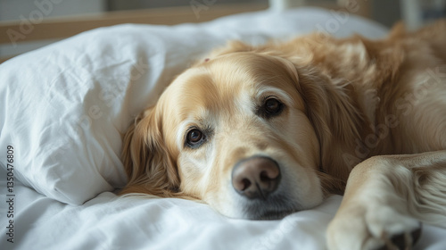 Golden retriever resting on bed, looking calm and gentle