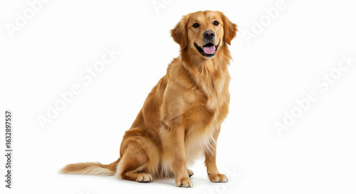 Golden retriever sitting with natural expression and soft fur detail, isolated on white background.