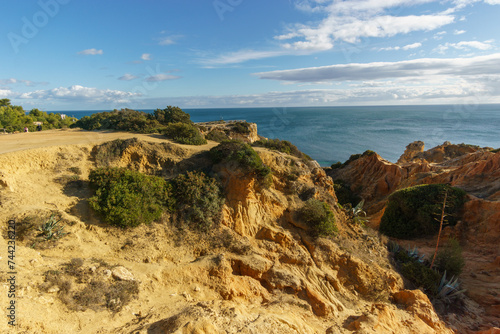 Golden rock cliffs at the coastline of the Atlantic Ocean with near the Cave of Benagil, Algarve, Portugal