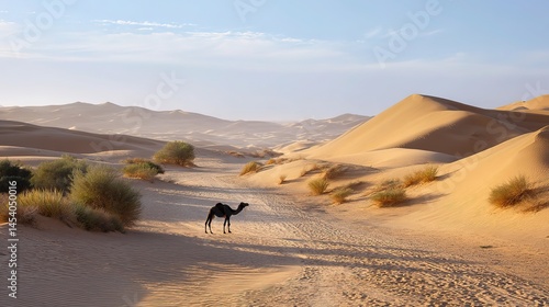 Golden sand dunes under blue sky with distant camel silhouette, conveying solitude and vast desert beauty