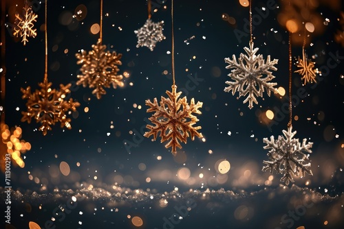 Golden snowflakes of the correct shape fall from the sky on a dark background. Generative AI.