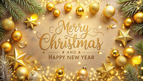 Golden sparkles with festive greetings for a Merry Christmas and a Happy New Year, Shimmering gold backdrop celebrating the holiday season with Christmas and New Year wishes.”