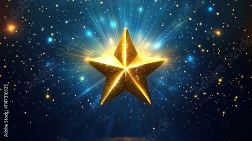 Golden star centered on a deep blue background, surrounded by radiant light beams and sparkling effects, creating a luxurious celebration design