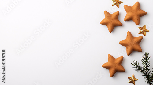 Golden star gingerbread cookies and decorations are arranged on a clean white surface for Christmas.