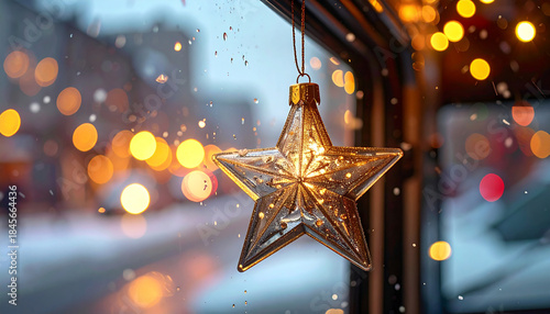 Golden Star Ornament in Winter Scene: A festive star ornament hangs in a window, capturing the sparkle of the season and setting a serene winter mood.