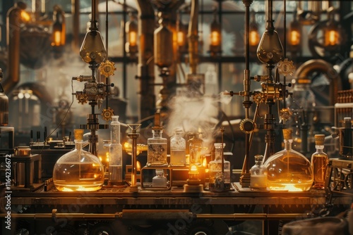 Golden Steampunk Laboratory with Intricate Contraptions and Tubes