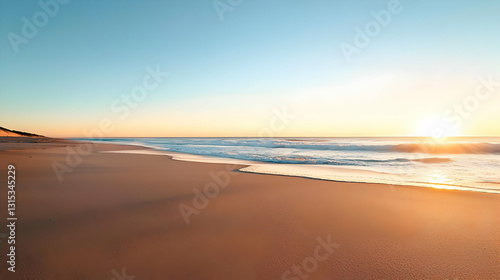 Golden Sunrise Over A Sandy Beach With Gentle Waves And A Clear Sky