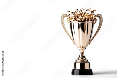 Golden trophy filled with confetti on a white isolated background.
