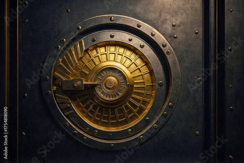 Golden Vault Door with Security Lock – Symbol of Banking, Finance, Wealth Protection, and Secure Storage with Metallic Design and Heavy Duty Construction