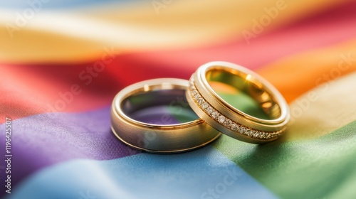 Golden wedding rings lying on a gently draped rainbow LGBT flag, conveying themes of pride, inclusion, and equal rights.