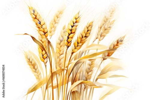 Golden wheat ears, ripe for harvest, stand isolated against a white background, symbolizing agriculture's bounty
