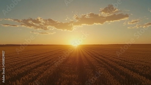 Golden wheat field at sunset. Vast agricultural landscape bathed in warm sunlight, showcasing rows of ripe wheat stretching to the horizon. A vibrant sky with a setting sun.