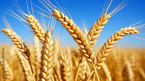 Golden wheat field with ripe grain spikes swaying under bright blue sky in warm summer sunlight representing agriculture, farming, harvest, and organic food production