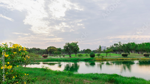 golf course with lush grass and the reflection of the trees in the pool makes it a beautiful view to play sports