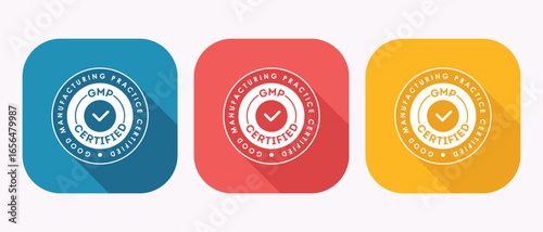 Good Manufacturing Practice Certified Icons in Various Colors and Shapes