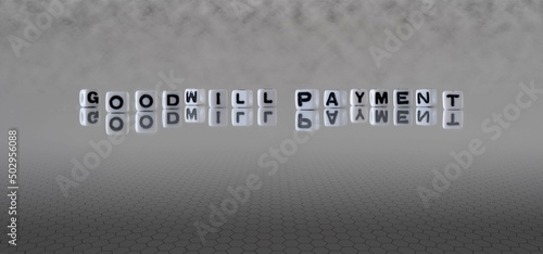 goodwill payment word or concept represented by black and white letter cubes on a grey horizon background stretching to infinity