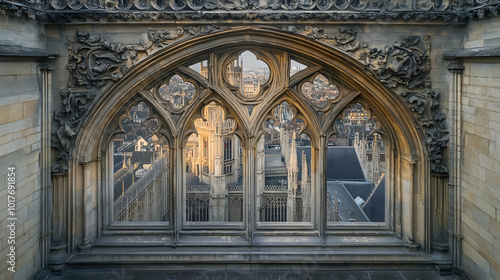 Gothic Arch Window with Cityscape View.
