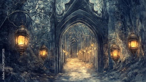 Gothic archway, flickering lanterns, winding path, Watercolor style