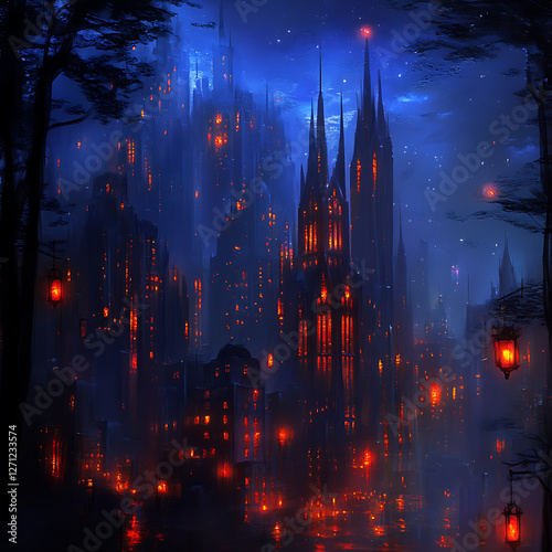 Gothic Cityscape at Night Radiating a Mystical Aura With Red Lights and Towers Under Dark Blue Sky