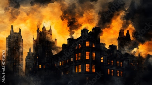 Gothic Cityscape Sunset Smoky Urban Landscape Dark Buildings Glowing Windows
