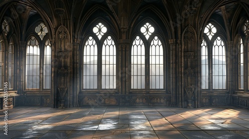 Gothic-style Hall With Tall Windows and Intricate Archways Illuminated by Soft Light