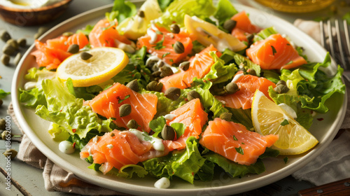 Gourmet Caesar salad with smoked salmon, capers, romaine lettuce, and lemon wedges