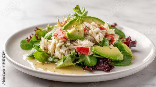 Gourmet crab and avocado salad with fresh greens and light vinaigrette. A delicious and healthy crab salad featuring succulent crab meat, creamy avocado slices
