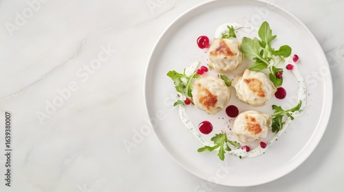 Gourmet dumplings served with arugula and raspberry sauce on plate
