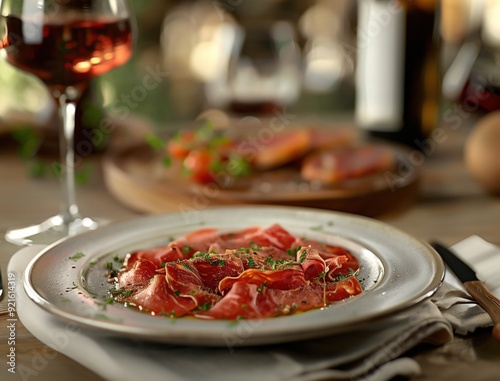 Gourmet flatlay of Spanish ham with fresh garnishes on black plate