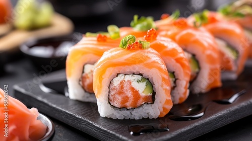 Gourmet salmon sushi rolls served on a black plate with garnishes, ready for a fine dining experience.