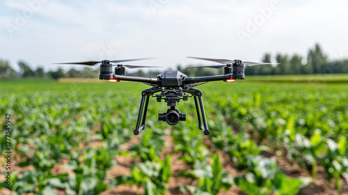 GPS controlled agricultural drone flying over green farmland, capturing data
