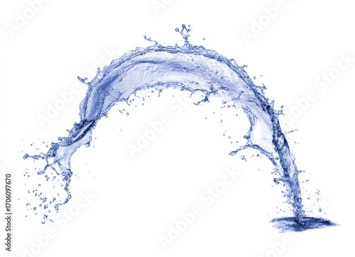 Graceful arc of splashing, clear liquid, elegantly poised against a pure white background, evoking fluidity and purity
