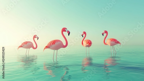 Graceful flamingos standing in serene shallow water with soft sky reflections