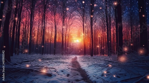 gradient evening sky with sunlight shine through tree trunk in winter forest, Generative Ai
