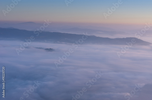 Gradient morning horizon. Clouds in the mountains.