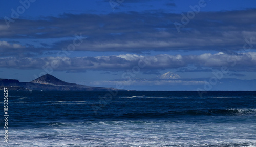 Gran Canaria, December, view towards snowy Teide on Tenerife from El Confital beach on the edge of Las Palmas de Gran Canaria