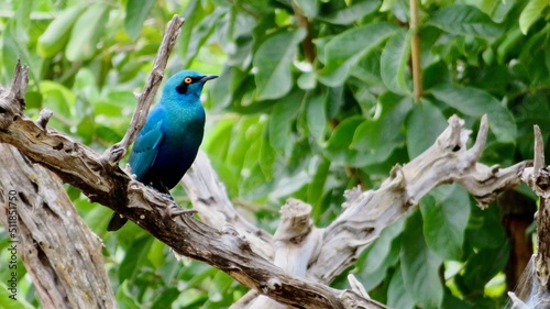 Gran estornino de orejas azules (Lamprotornis chalybaeus) posado en una rama con fondo verde
